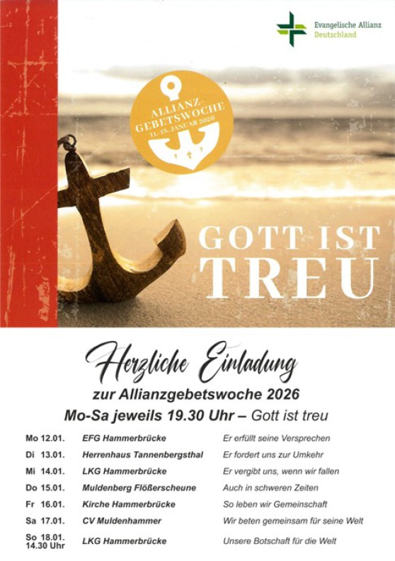 Allianzgebetswoche Mo. 12.01. bis Sa. 17.01. jeweils 19.30 Uhr Veranstaltungen siehe Unten